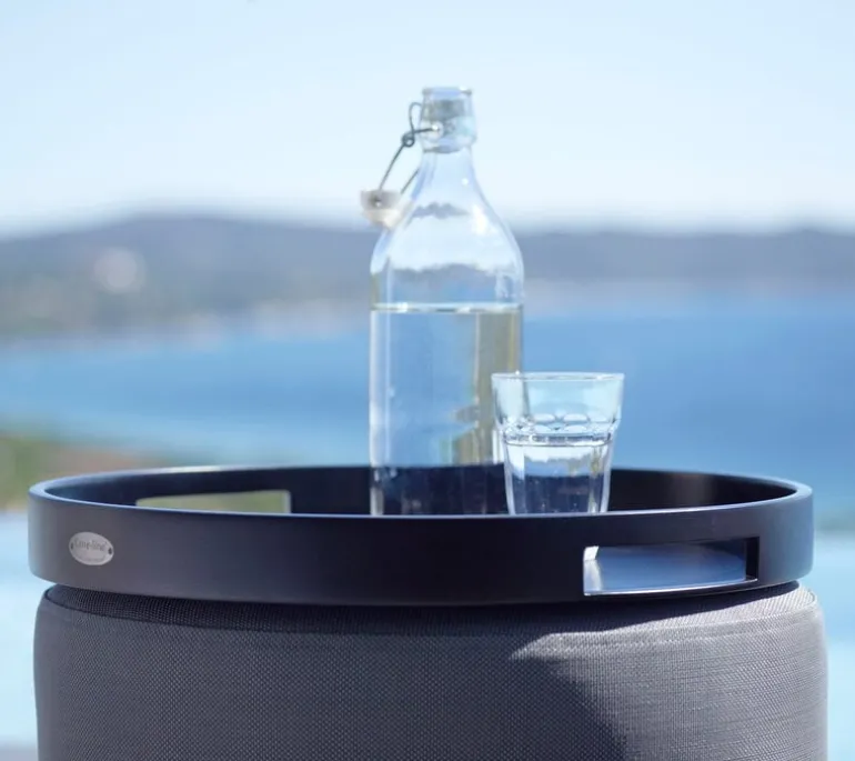 Du kan också placera Club-brickan ovanpå en matchande fotpall för att förvandla den till ett litet soffbord – den runda brickan passar Cane-lines runda fotpallar.