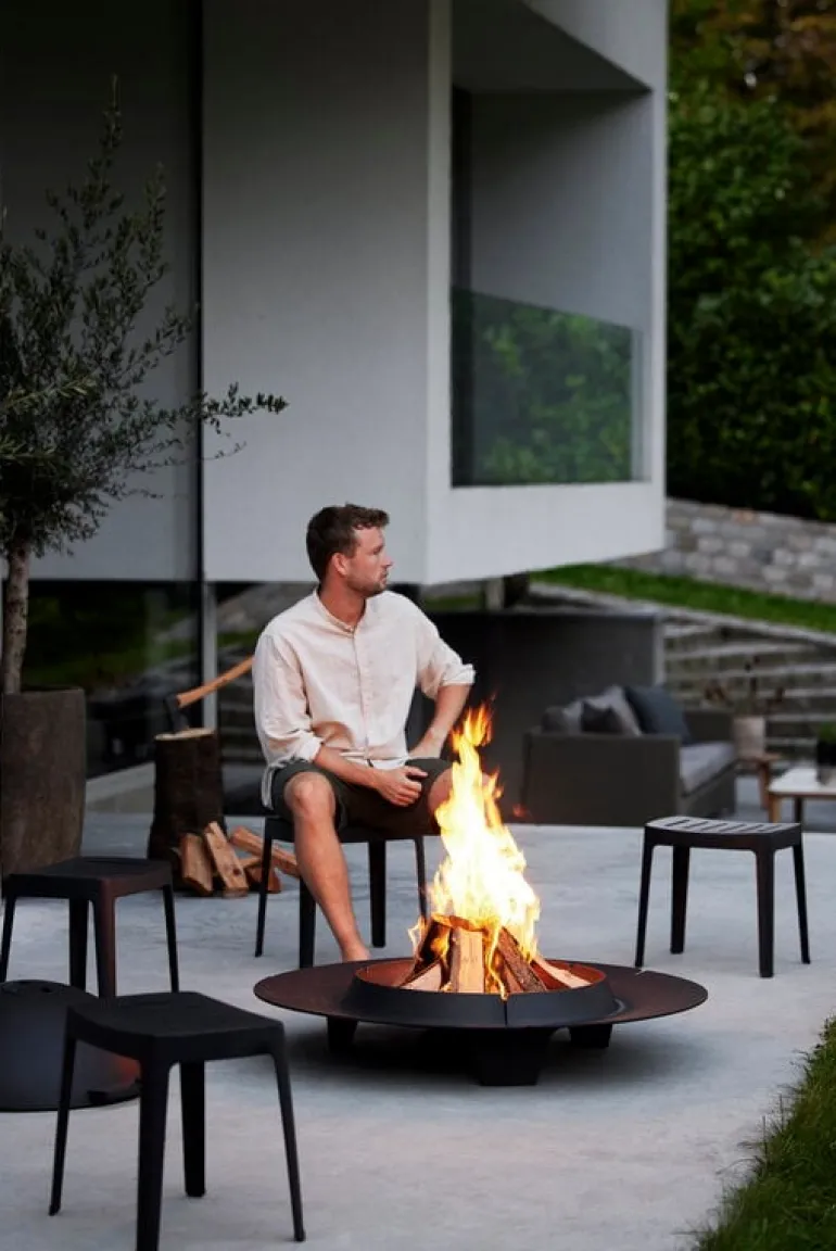 Cane-lines Ember eldstad inbjuder dig att samlas runt en lägereld eller njuta av mat lagad över öppen eld. Eldstaden, som är designad av studion Strand+Hvass, är fristående och tillverkad av gjutjärn, ett särskilt hållbart och robust material. Dess flytande, runda design har dräneringshål för avrinning av regnvatten.