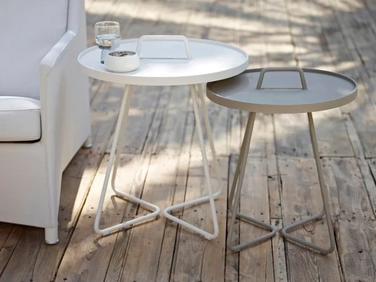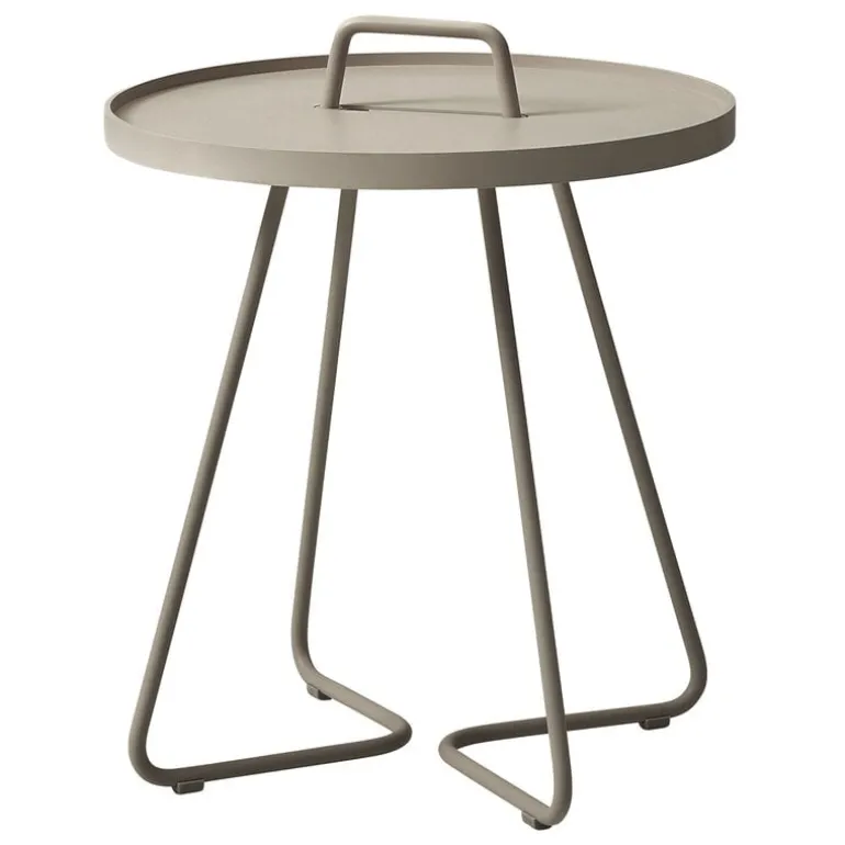 Cane-lines On-the-move är ett ljust och multifunktionellt sidobord som är lämpligt både för inomhus- och utomhusbruk. Bordet är tillverkat av slittåligt och lätt aluminium och har ett handtag. On-the-move är lätt att flytta från en plats till en annan. Den avtagbara bordsskivan fungerar också som bricka och kan lyftas av och användas separat. On-the-move är ett perfekt sidobord för terrasser, balkonger eller trädgårdar och passar också som ett modernt och praktiskt soffbord i vardagsrummet. Bordet designades av den danska designbyrån Stand+Hvass.