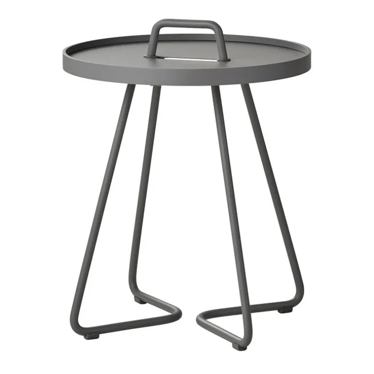 Cane-lines On-the-move är ett ljust och multifunktionellt sidobord som är lämpligt både för inomhus- och utomhusbruk. Bordet är tillverkat av slittåligt och lätt aluminium och har ett handtag. On-the-move är lätt att flytta från en plats till en annan. Den avtagbara bordsskivan fungerar också som bricka och kan lyftas av och användas separat. On-the-move är ett perfekt sidobord för terrasser, balkonger eller trädgårdar och passar också som ett modernt och praktiskt soffbord i vardagsrummet. Bordet designades av den danska designbyrån Stand+Hvass.