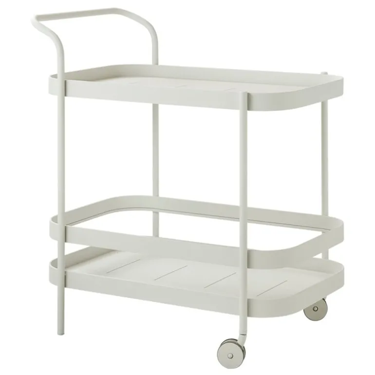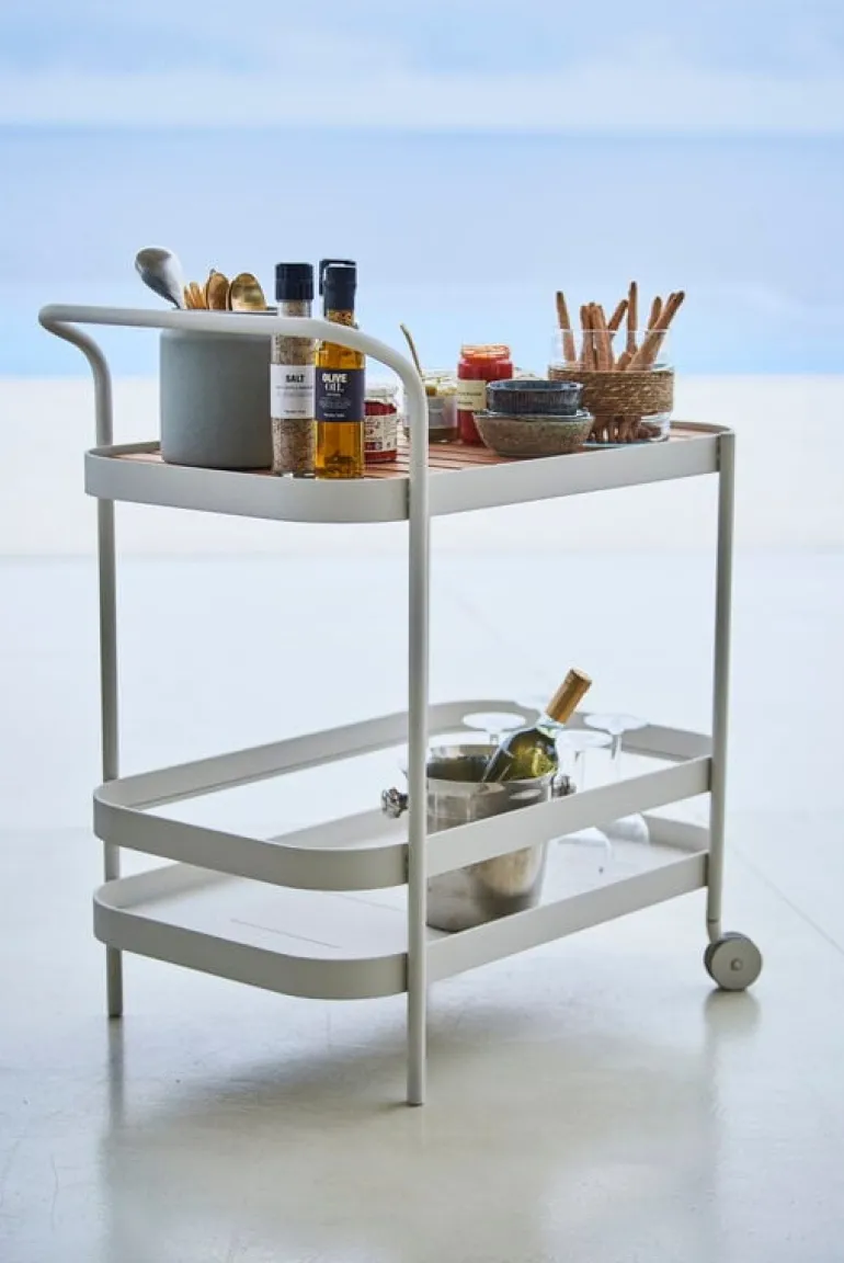 Roll barvagn, designad av Welling/Ludvik för Cane-line, är en modern och multifunktionell utemöbel som enkelt smälter in i en mängd olika utrymmen för olika ändamål. Tack vare dess hållbara men ändå lätta aluminiumram är Roll ett utmärkt alternativ för uteplatsen eller trädgården, men kan lika gärna placeras i köket eller vardagsrummet. Den avtagbara teakplattan gör att du kan ändra utseendet på vagnen på ett ögonblick – placera den upp, flytta den ner eller ta bort den helt. Den smarta funktionen gör också att det blir lättare att rengöra vagnen.