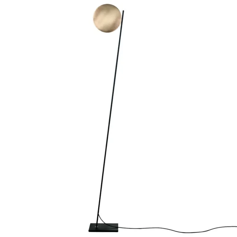 Golvlampan Lederam F0 från Catellani & Smith kombinerar en smäcker svart metallram med en rund, gyllene lampskärm. En dimbar LED-modul är integrerad i den skivformade skärmen, vilket gör att ljuset kan riktas precis dit du vill – du kan använda det som en fokuserad spotlight eller reflektera ett mjukt sken mot väggen eller taket.