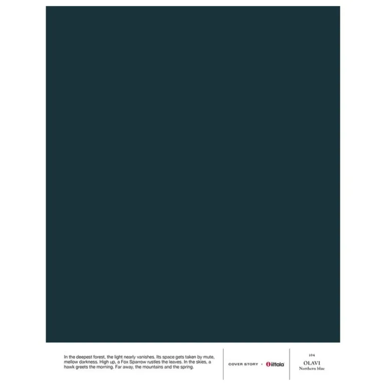 Cover Storys nyans i04 Olavi är en mörk marinblå med petrolundertoner som gör den till det perfekta paret för kallare toner – men också den idealiska motparten för varma vita. När det gäller möbler kompletterar den mystiska blå nyansen mörkare trätoner och patinerade ytor. Som en del av Cover Story x Iittala-kapselkollektionen är färgen inspirerad av Iittalas omfattande glasfärgarkiv: Olavis slående nyans är Cover Storys tolkning av Iittalas blåfärgade glas.