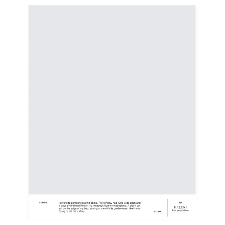 Nyansen 014 Haruki är en vacker blågrå, vars nyans passar ihop med pastellfärger, men också är en fin bakgrund till vitt. Likt alla Cover Storys färger, ger Haruki ytan en platt, sammetsliknande och ickereflekterande finish.