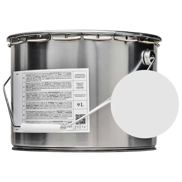 Cover Storys inomhusfärg i nyansen 034 Elena är perfekt när du vill ljusa upp rummet på ett behagligt sätt. Den något gråvita nyansen bildar en harmonisk fond till både neutrala och maximalistiska färgspektra, och den vita nyansen är dessutom perfekt att använda överallt till alla utrymmen. Den naturvita nyansen har skapats av Ulla Koskinen och kan användas både till väggar och tak – den helmatta färgen ger den målade ytan en dämpad, sammetsliknande finish.