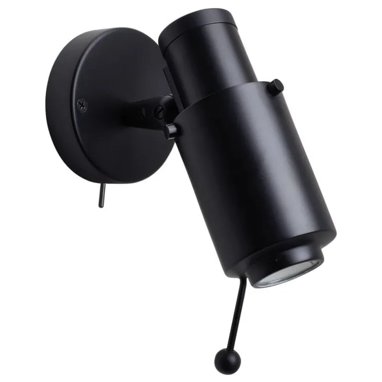 Biny Spot-vägglampan riktar en skarp ljusstråle på ett specifikt område tack vare kulleden som lutar 88 grader och roterar 330 grader. Utseendet på den lilla praktiska Biny Spot-lampan kompletteras med en spak med en kula på, och den har också hårdkopplade väggfästen.