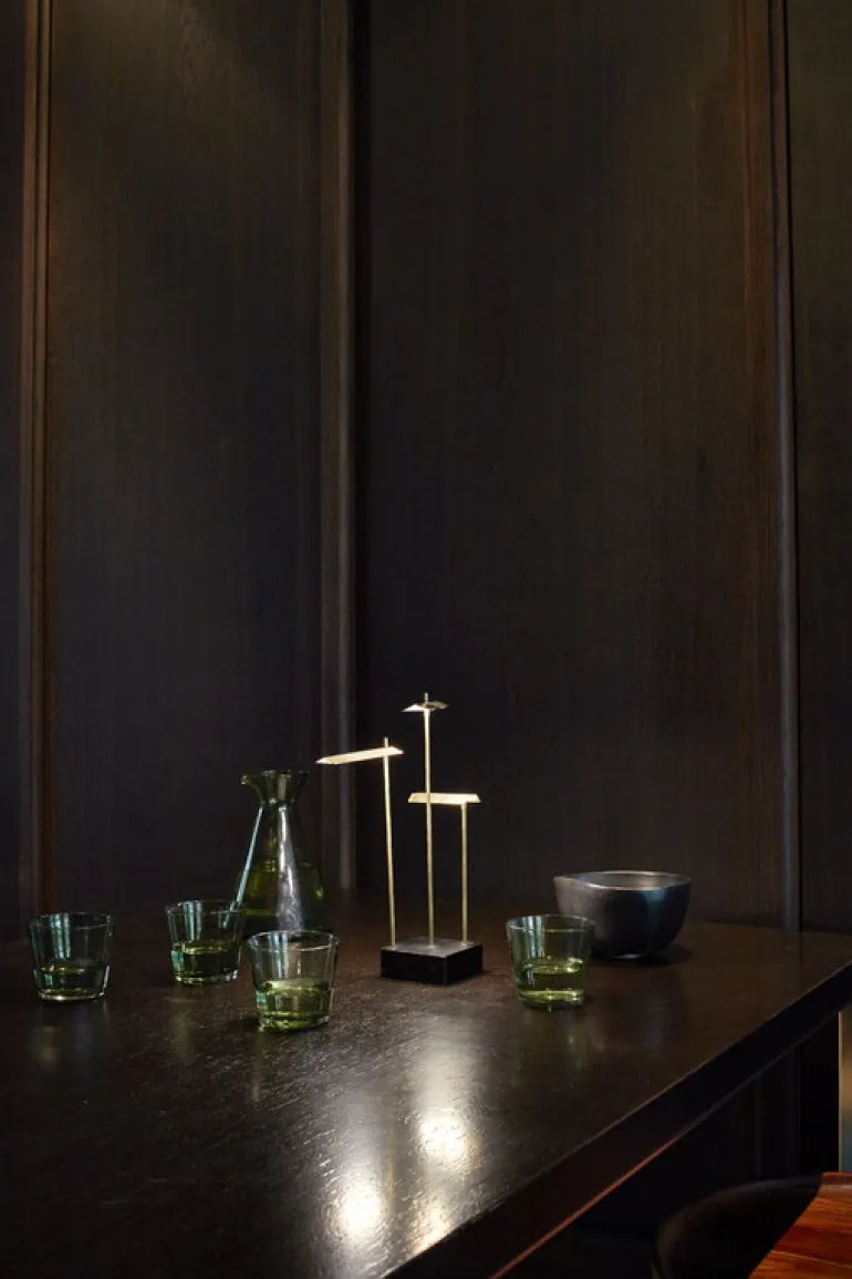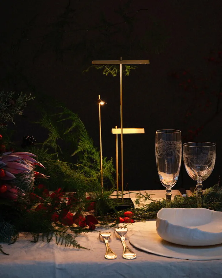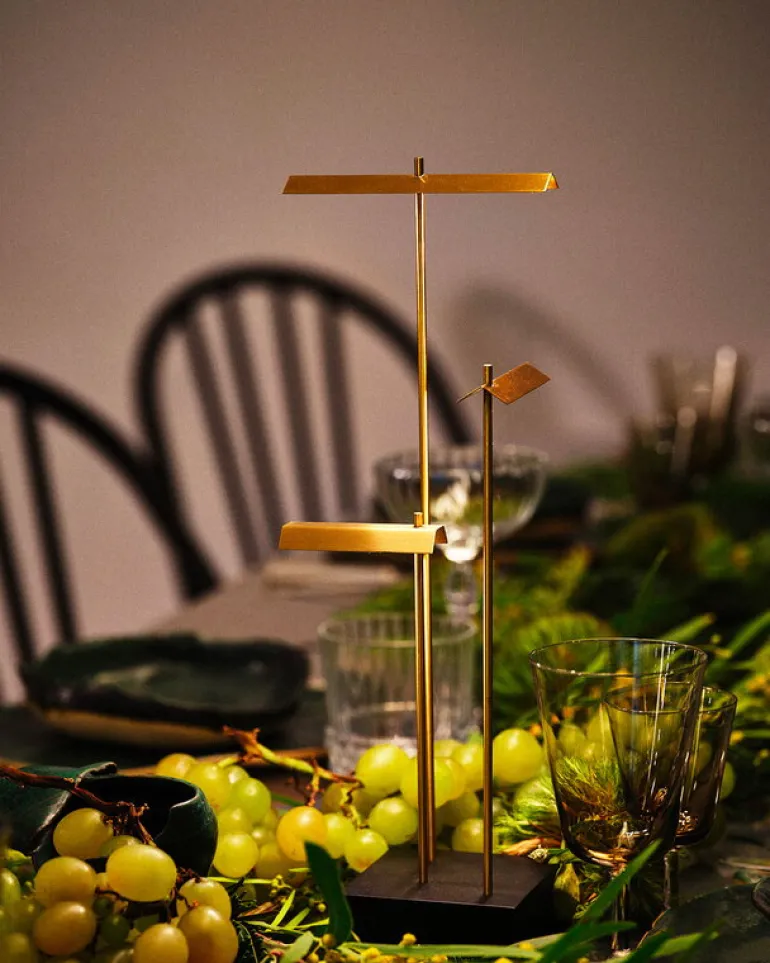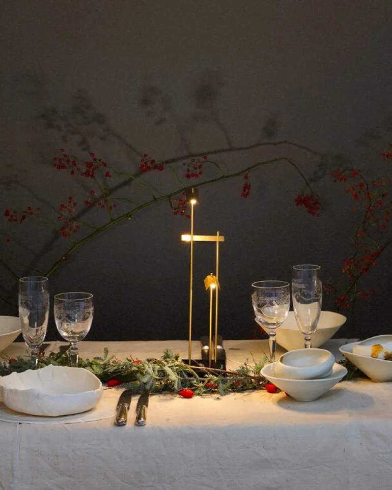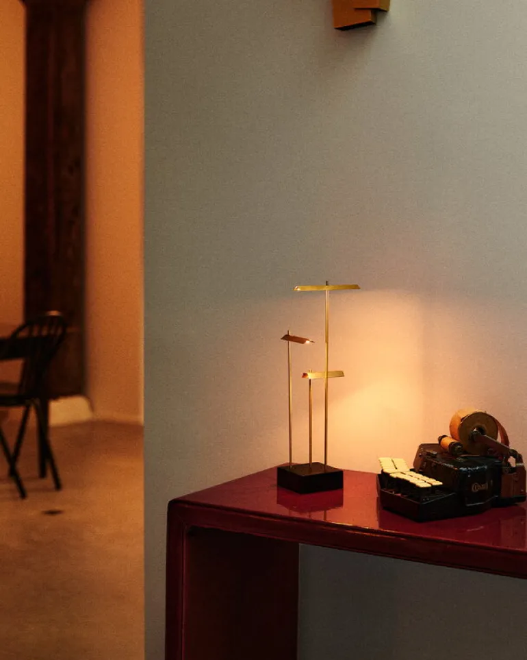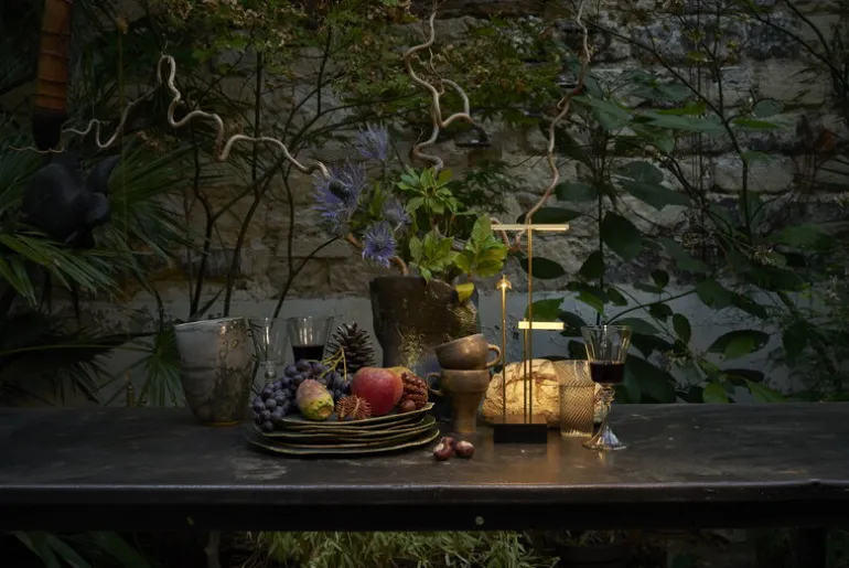 Bordslampan Knokke från DCW éditions är en lampskulptur som avger ett milt sken och skapar en rogivande atmosfär i rummet. Knokke består av tre ljuskällor som är inbyggda i varsin mässingsstång – en konstruktion som ger upphov till en fascinerande växelverkan mellan ljus och skugga. Den sladdlösa lampan är enkel att flytta från rum till rum, så att du kan ta med dig dess fridsamma stämning vart du än går. Bordslampan är uppladdningsbar via USB och batteriet håller i upp till 12 timmar på en laddning. Även om skenet som strålar ut från Knokke är ganska dämpat som det är, ungefär som från levande ljus, går det ändå att dimma ljusstyrkan så att den passar till platsen och sammanhanget.