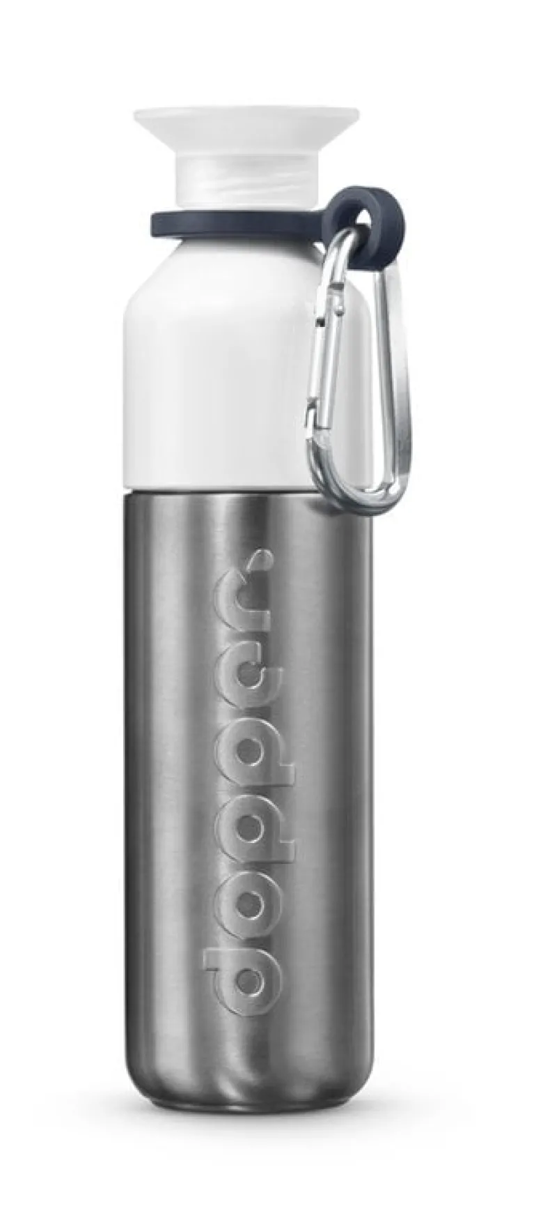 Med Dopper-flaskhållaren kan du se till att din Dopper dricksflaska alltid finns inom räckhåll. Hållaren är utrustad med en lätt, men rejäl karbinhake i aluminium, och med den kan du kan haka fast vattenflaskan i din väska, ditt skärp etc. Den mörkblå färgen ger hållaren en elegant touch.