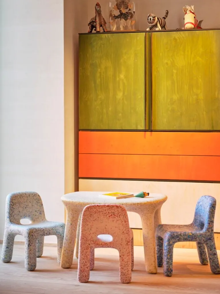 Charlie från ecoBirdy är en multifunktionell stol, där familjens yngsta medlemmar kan sitta och skapa konst, äta eller göra sina läxor. Den lätta stolen är ett tryggt val också för de minsta som klarar av att sitta: trots dess låga vikt är stolen så pass stadig att den inte välter ens under barnens vildaste lekar. Kanske förvånas du över materialet i stolen, för Charlie är nämligen tillverkad av återvunna plastleksaker – de färgglada små prickarna som pryder stolen har alltså varit barnleksaker i ett tidigare liv! Den mjuka designen och de lekfulla färgerna är estetiskt tilltalande även för föräldrarnas ögon, vilket gör att stolen Charlie inte bara blir ett perfekt tillskott i barnkammaren, utan också i andra rum i bostaden.
