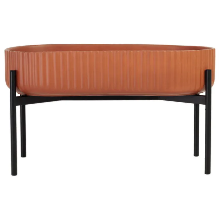Elementas Klorofyll växtstativ består av en oval blomkruka och en bred bas som tillsammans ger en elegant inramning för en mängd olika krukväxter. Den terrakottafärgade krukan är gjord av pigmenterad betong och det enkla geometriska stativet är gjort av svart pulverlackerat metall.