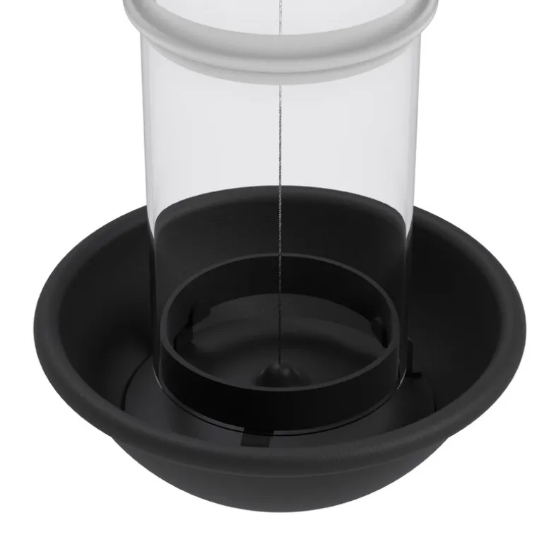 Eva Solos fågelmatare De Luxe är en modern gestaltning av den klassiska hängande fågelmataren. Fågelmataren, som är gjord av frosttåligt glas, stål och silikon, har konstruerats så att småfåglarna enkelt och säkert kommer åt maten. Det stora taket i metall ger skydd och håller stora fåglar borta. Behållaren är enkel att fylla på och rymmer 750 ml fågelmat.