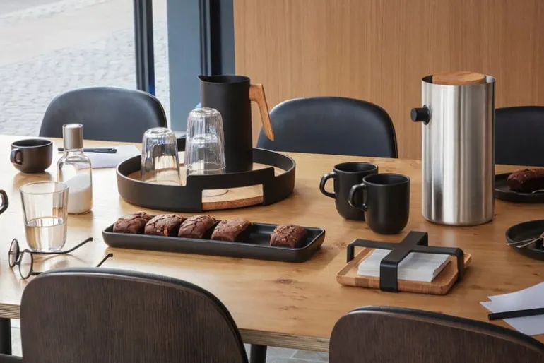 Eva Solos termoskanna Nordic Kitchen Pump är en perfekt lösning för att hålla kaffet och teet varmt åt större grupper. Den minimalistiska och eleganta pumptermosen rymmer 1,8 liter och ser till att det finns tillräckligt med varm dryck till alla som vill ha. Locket i ek och det rostfria stålets eleganta glans gör att termosen Nordic Kitchen Pump passar perfekt till fester och högtidliga tillfällen, men det inbyggda handtaget gör också att den är enkel att ta med, exempelvis till en picknick i parken.