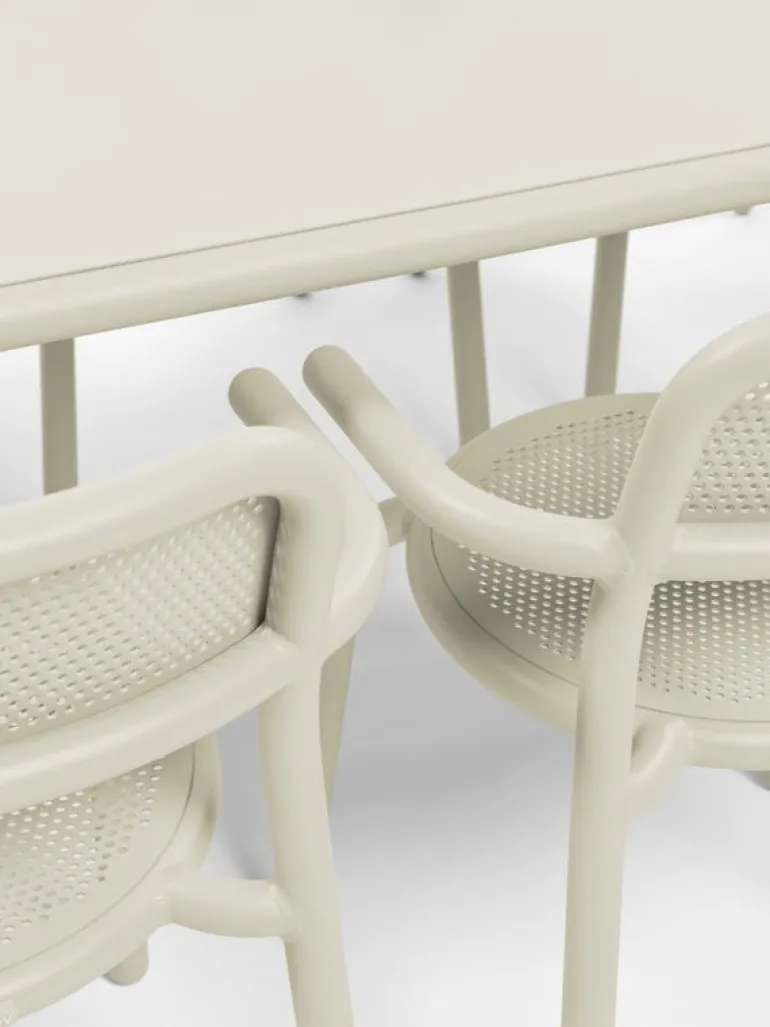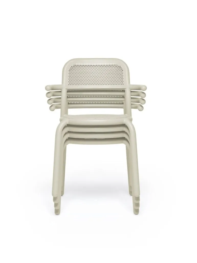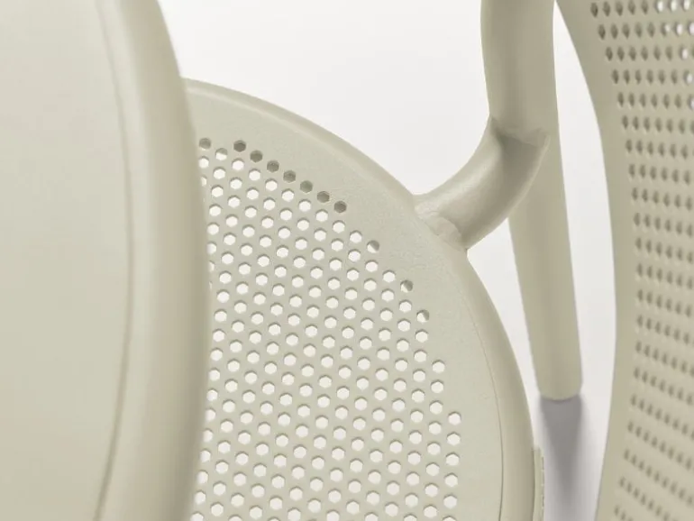 Trädgårdskarmstolen Toni från Fatboy har en rolig design som både har industriella inslag och referenser till klassiska cafémöbler. Den rörformade ramen liknar säkerhetsräcken, medan sitsen och ryggstödet med sin perforering påminner om traditionella stolar från Wien. Trädgårdsstolarna Toni är stapelbara och enkla att flytta.