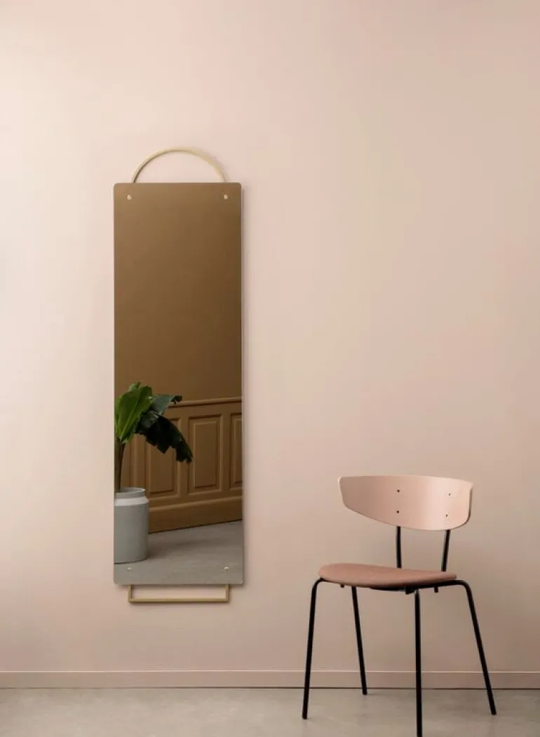 Adorn-spegeln från ferm LIVING är en enkelt elegant reflektor för väggen i hallen, badrummet eller sovrummet. De mässingsfärgade ornamenten på toppen och botten fulländar utseendet på den minimalistiska spegeln, ger den en touch av elegans och utsmyckning – och också dess namn, Adorn. Den oramade spegeln kan monteras direkt på väggen eller placeras för att luta mot den.