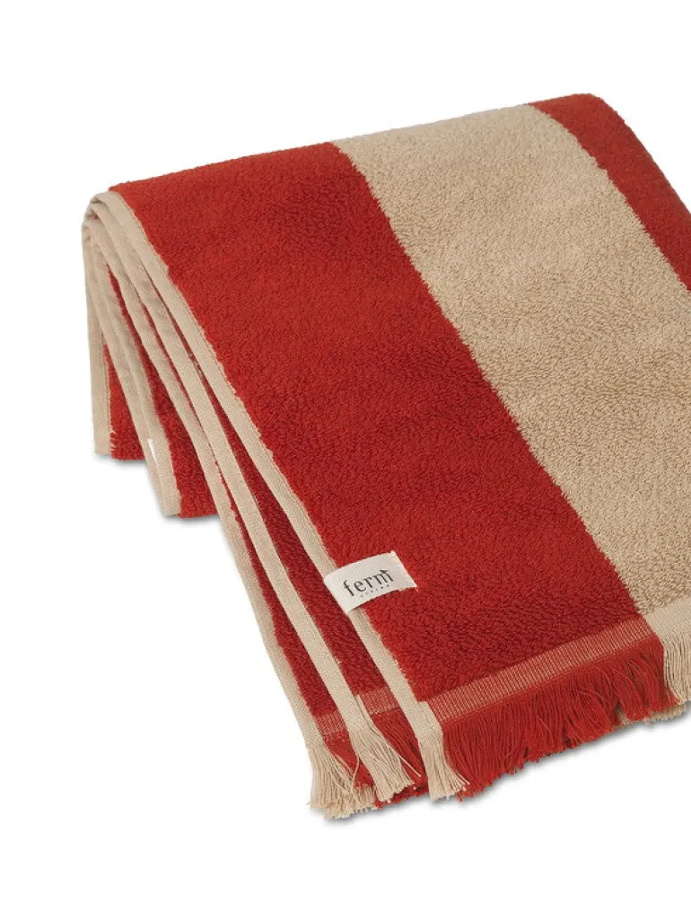 Ferm LIVING:s Alee badhandduk ger ett inslag av sofistikerad avslappning till badrumsinredningen – den plyschiga handduken är också perfekt för alla soliga dagar på stranden. Det uppfriskande randiga mönstret piggar upp utrymmet och de lättsamma fransarna ger en karismatisk finish till Alee-handduken, som är tillverkad av ekologisk bomull.