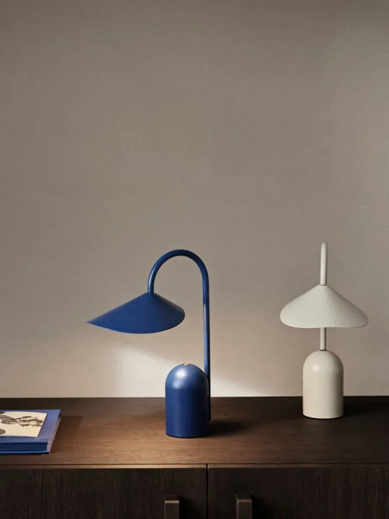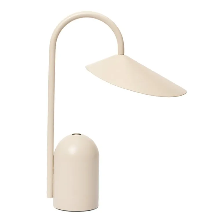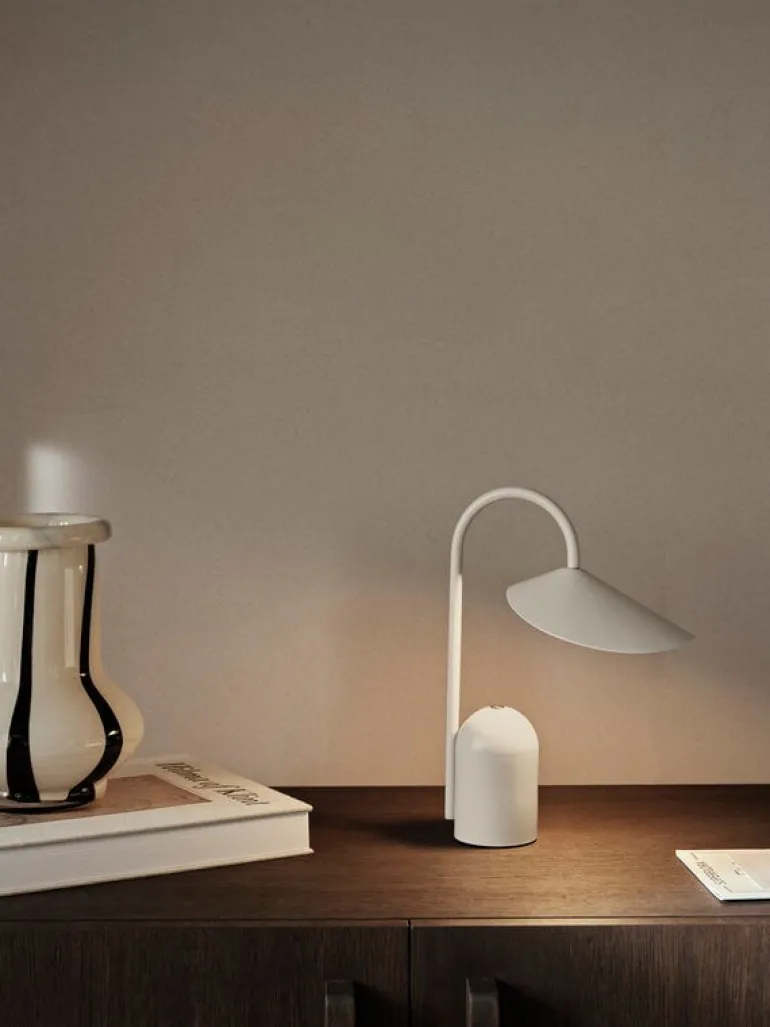 ferm LIVING:s bärbara bordslampa Arum är enkel att flytta från fönsterbrädan till soffbordet eller från skrivbordet till matbordet, där ljuset behövs. Denna trådlösa lampa, som laddas med USB-C-kabel, har en dimmer med tre nivåer och batteriet räcker i 8–24 timmar på en enda laddning, beroende på ljusstyrka.