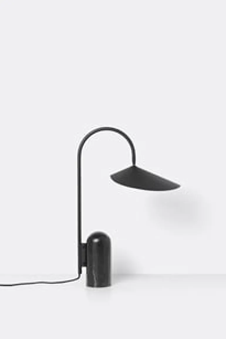 Ferm Livings bordslampa Arum kombinerar mjuka, organiska linjer med den naturliga skönheten hos marmorn i underdelen. Namnet Arum kommer av växtsläktet med samma namn. Dess späda bladliknande skärm kan justeras för att passa som antingen arbetsbelysning eller stämningsbelysning. Skärmens insida i matt off-white bidrar till att filtrera ljuset jämnt, vilket ger en mjuk och välkomnande atmosfär i sovrum, vardagsrum eller kontor.