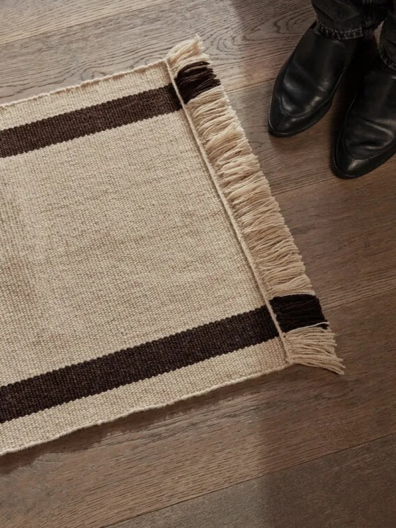 ferm LIVINGss Calm Kelim-matta har ett längsgående rutmönster i lugna, jordnära toner. Den här lilla, minimalistiska ullmattan passar perfekt som dörrmatta.