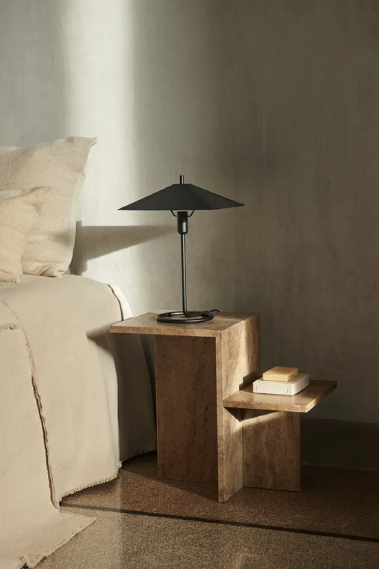 Sidobordet Distincts spännande design är baserad på motsatser vilket ger upphov till komplexa strukturer, trots att bara ett enda element har använts. Bordets luftiga struktur, som inspirerats av japansk minimalism, skapar en unik kontrast till travertinens naturliga textur och skiftande nyanser. Den mörkbruna kalkstenens naturliga stil ger den geometriska strukturen ett mjukare intryck, som i sin tur ger Distinct ett luftigare helhetsintryck, som i övrigt domineras av det robusta materialet. ferm LIVING:s skulpturala Distinct-bord fungerar utmärkt som sidobord i vardagsrummet eller i hallen.