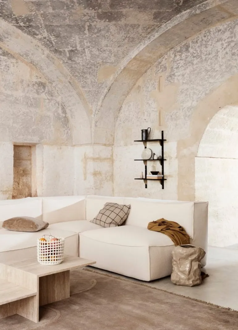 ferm LIVING:s soffbord Distinct inspirerades av japansk estetik. Bordets skulpturala design bygger på motsatser och skapandet av komplexa strukturer med hjälp av ett enda element. Soffbordets unika utseende skapas genom att förena japansk minimalism med travertins naturliga textur och varierande nyans. Den naturliga, sandfärgade kalkstenen ger balans och mjukhet till det geometriska och robusta utseendet på soffbordet Distinct.