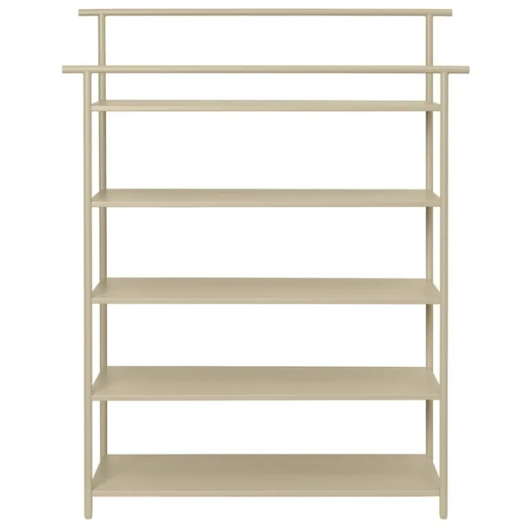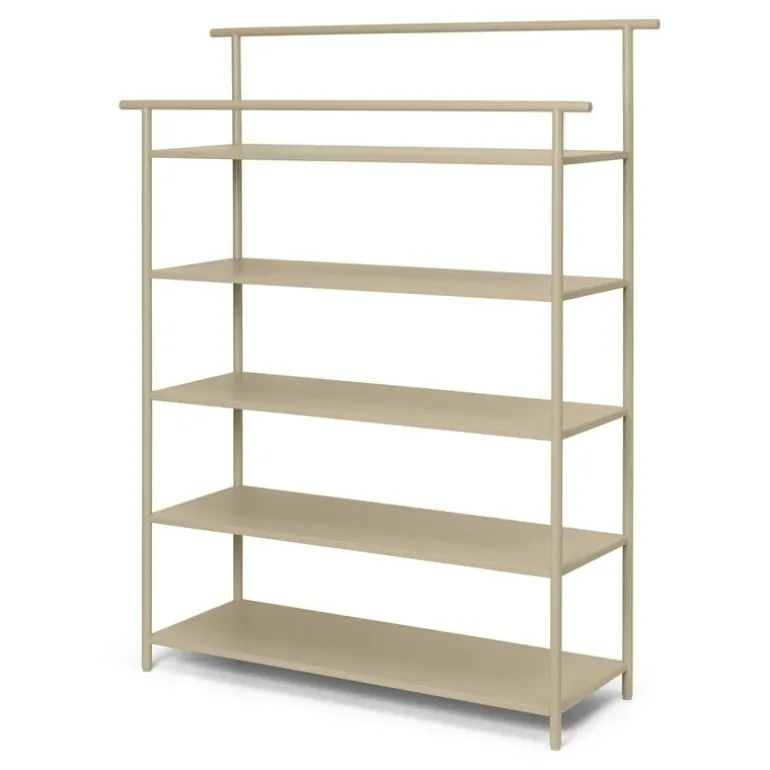 Hyllan Dora från ferm LIVING har fem hyllor där du kan förvara skor, halsdukar eller andra tillbehör i hallen, tallrikar i köket eller schampoflaskor och smink i badrummet. Dora influerades av den japanska estetiken och utvecklades för att vara smal och tunn så att den passar i små utrymmen. Den slimmade Dora är tillverkad av galvaniserat järn.