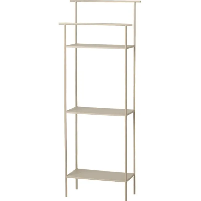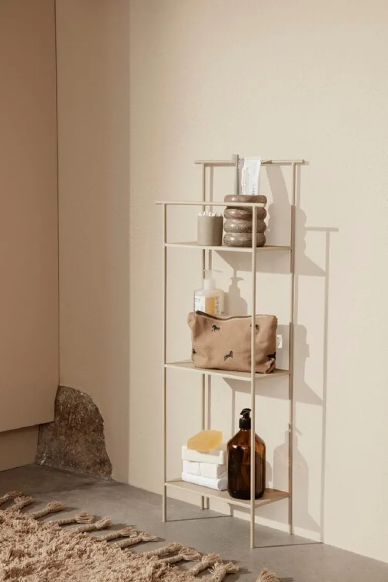Ferm Livings hylla Dora erbjuder ett elegant sätt att förvara dina saker i badrummet, från smink till handdukar och annat viktigt. Den fristående hyllan är influerad av japansk estetik och har en elegant metallstruktur som gör att den även får plats i trånga utrymmen. Du kan även använda Dora till förvaring i andra delar av hemmet utanför badrummet.