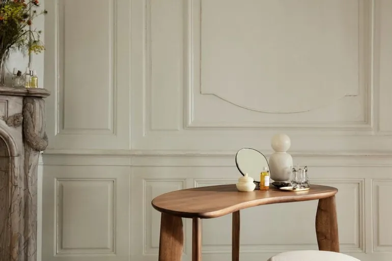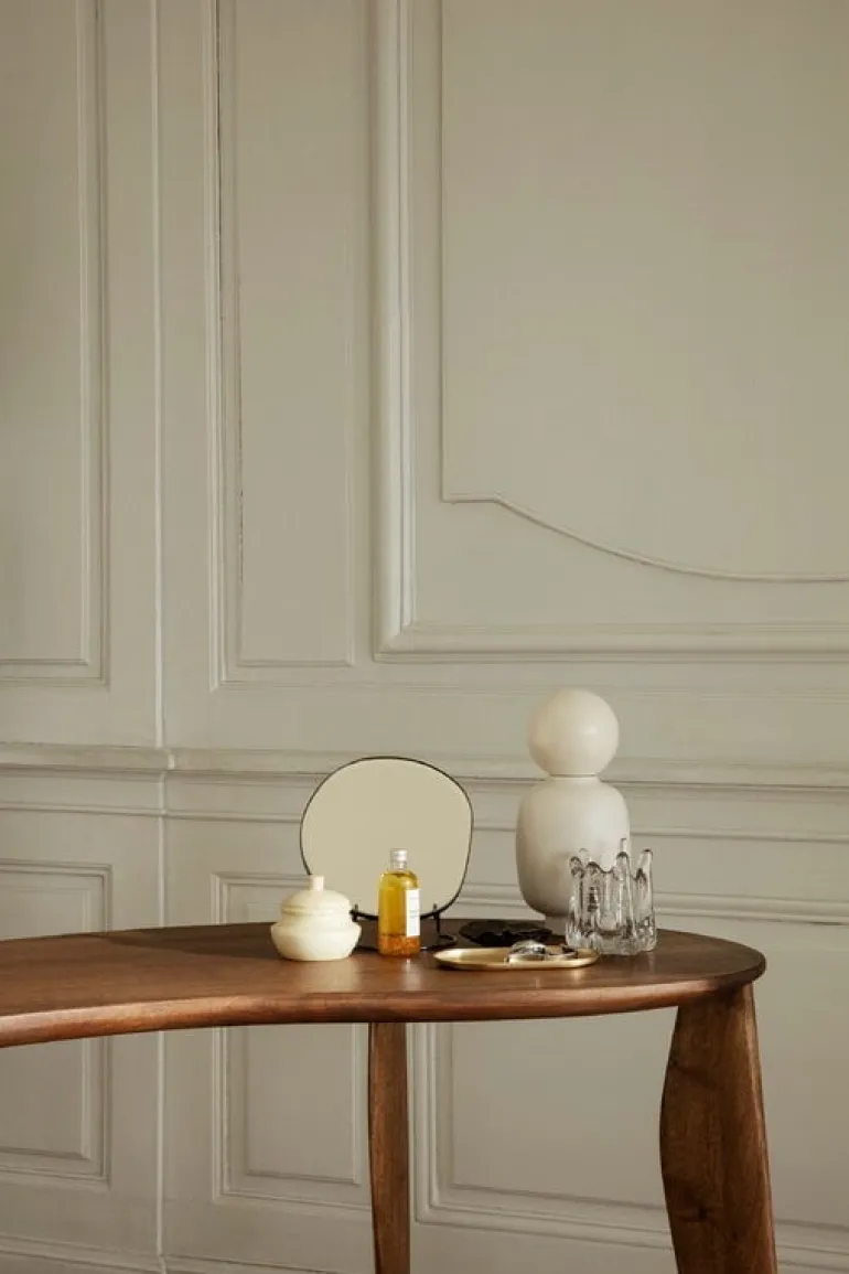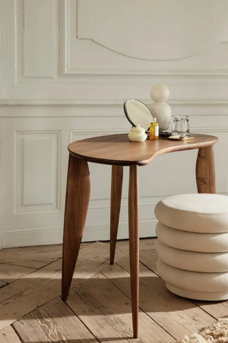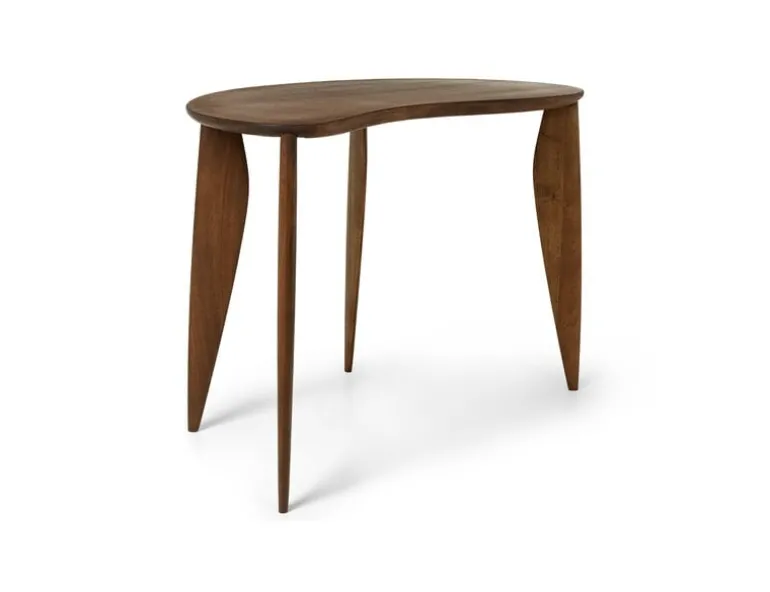 ferm LIVING:s skrivbord Feve förtrollar med sin organiska form och naturliga utseende. Bordet är tillverkat av europeiskt, ansvarsfullt producerat valnötsträ och består av vackert rundade ben och en smal, bönböjlig bordsskiva. Namnet Feve hänvisar faktiskt till dess form: det franska ordet fève översätts bokstavligen till “böna”. Det kompakta bordet kan användas som ett litet skrivbord eller sminkbord, samt som ett vackert och praktiskt entrébord för entrén eller hallen.