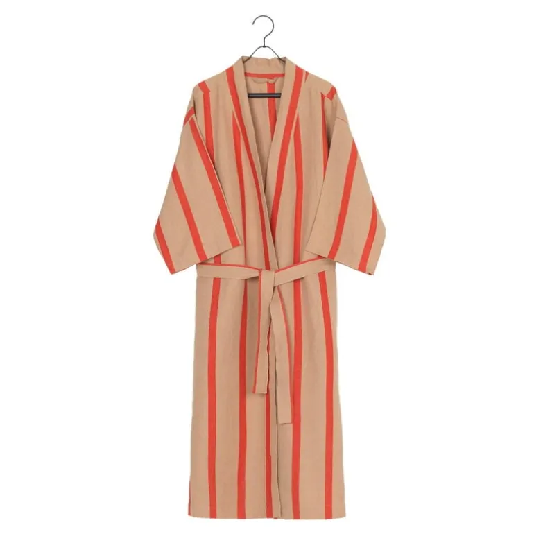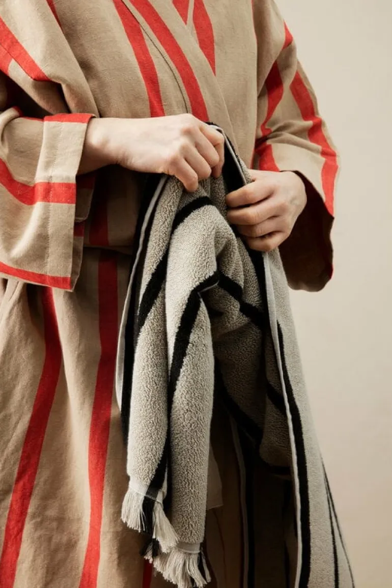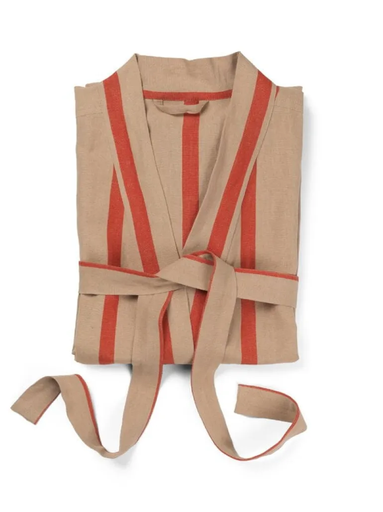 Morgonrocken Field från ferm LIVING gör att du känner dig lockad att koppla av en stund. Svep in dig i rocken och vakna till i din egen takt – eller njut av den avslappnande känslan efter bastun eller duschen lite längre. Morgonrocken Field har ett uppfriskande, randigt mönster med matchande skärp, vilket bara gör den vackra rocken än mer elegant. Den stunsiga blandningen av bomull och linne gör rocken lätt och snabbtorkande – den snygga morgonrocken Field är dessutom perfekt att ta med till stranden eller sommarstället.