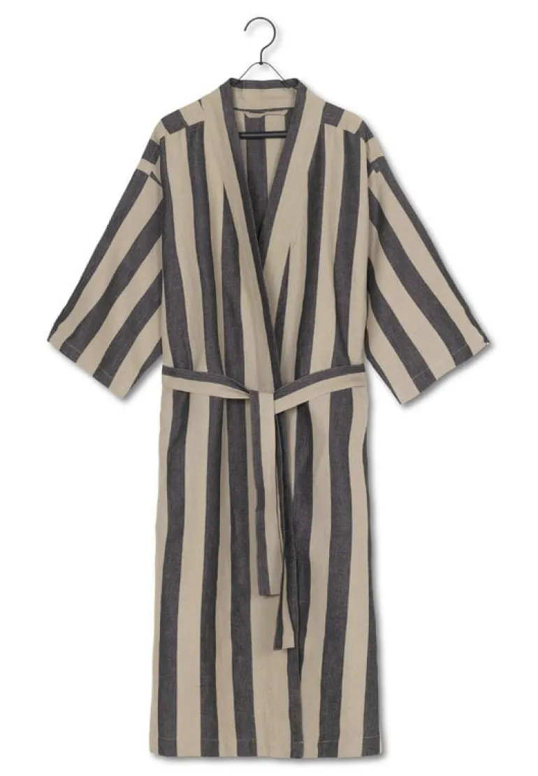 Morgonrocken Field från ferm LIVING gör att du känner dig lockad att koppla av en stund. Svep in dig i rocken och vakna till i din egen takt – eller njut av den avslappnande känslan efter bastun eller duschen lite längre. Morgonrocken Field har ett uppfriskande, randigt mönster med matchande skärp, vilket bara gör den vackra rocken än mer elegant. Den stunsiga blandningen av bomull och linne gör rocken lätt och snabbtorkande – den snygga morgonrocken Field är dessutom perfekt att ta med till stranden eller sommarstället.