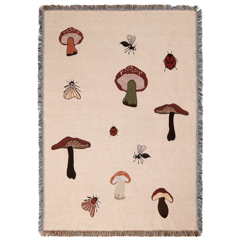 ferm LIVING:s Forest-filt för in en touch av naturen i din heminredning med sitt charmiga mönster som avbildar svampar och insekter som skulle kunna komma direkt från en sagolik skog. Filten är vävd med samma teknik som klassiska gobelänger – den kan användas som en dekorativ pläd på en soffa eller fåtölj samt hängas upp på väggen. Filten är tillverkad av bomull, är avslutad med fransar runt om och levereras i en speciell presentförpackning.