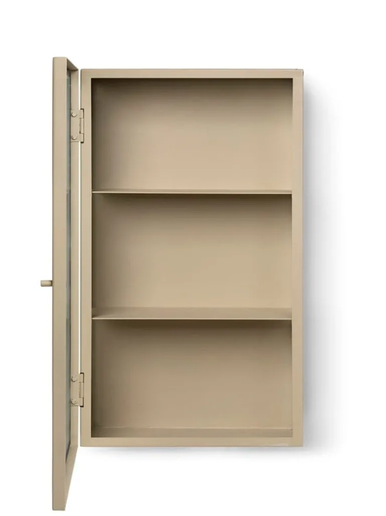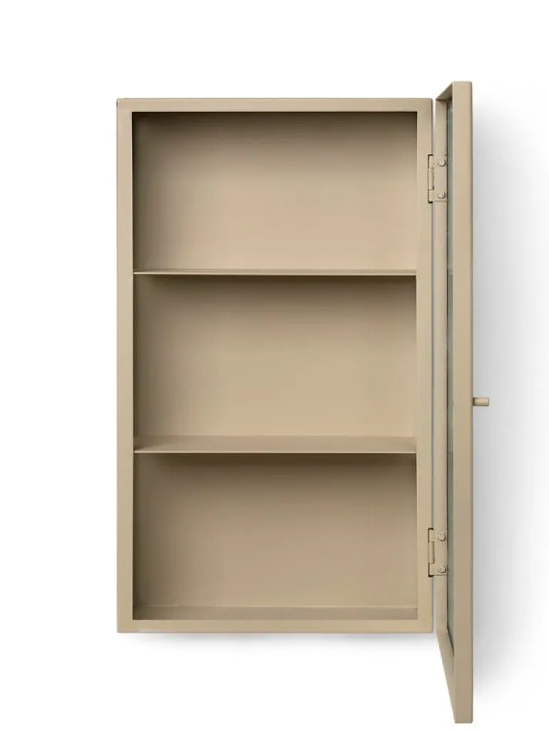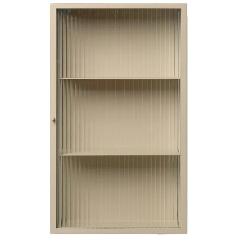 Ferm Livings Haze-kollektion kännetecknas av enkla snitt och grova, industriella material: arken av matt, ribbat glas ramas in av mjukt kashmir-färgad, pulverlackerad metall. Det kompakta Haze-skåpet har två metallhyllor som är perfekta för förvaring av badrumstillbehör eller kökets alla muggar och burkar.