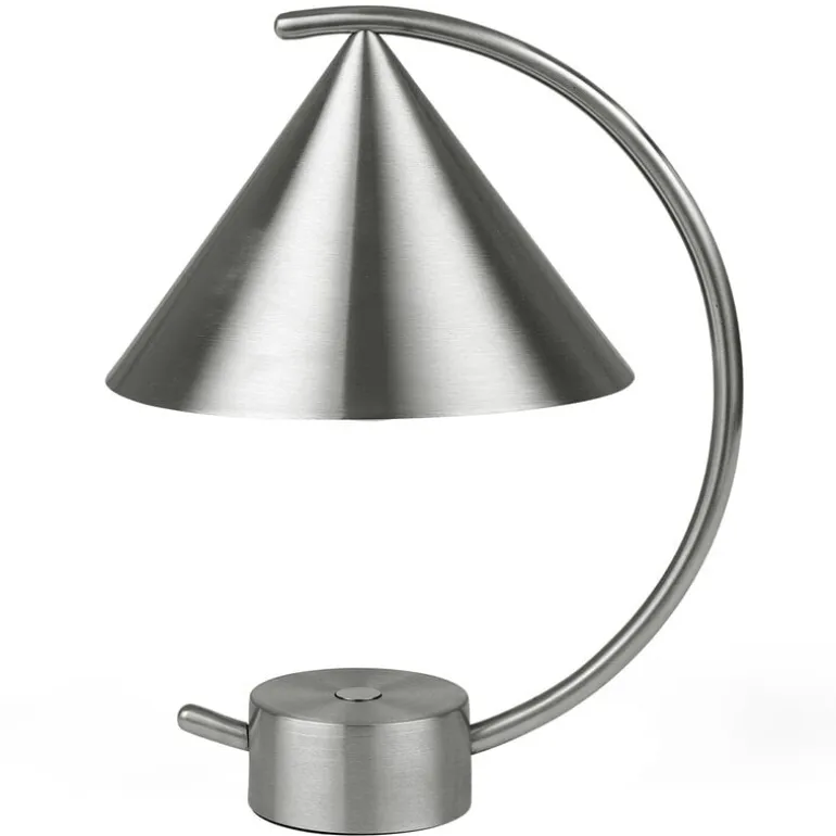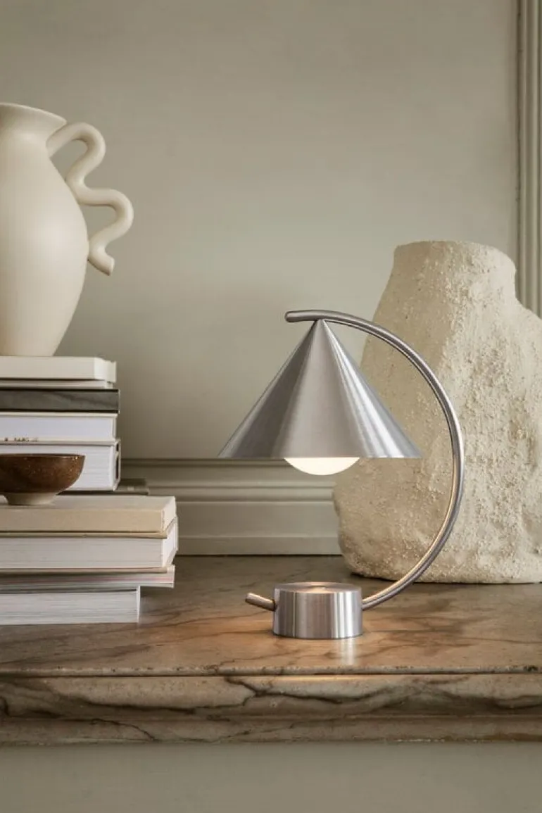 Bordslampan Meridian, från Ferm Living, tillverkas i samarbete med designstudion Regular Company. Lampans säregna och skulpturala design kombinerar tre geometriska element, vilket skapar en modern och lekfull känsla. Den har en kompakt storlek och en bärbar utformning, vilket gör den sladdlösa lampan enkel att flytta på. Den passar utmärkt till att skapa en mysig stämning med på ett sidobord eller en hylla. Den dimbara bordslampan lyser i upp till 12 timmar på en laddning.