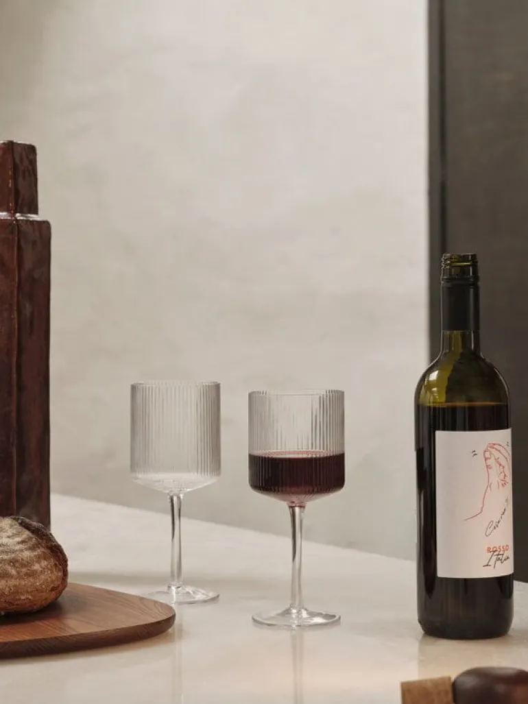 Rödvinsglasen Ripple från ferm LIVING kombinerar modern design med gammaldags nostalgi. Med en smal, kort fot och en distinkt vågig ovansida ger Ripple-glasen en elegant touch till varje fest. Ripple-glasen säljs i 2-pack.