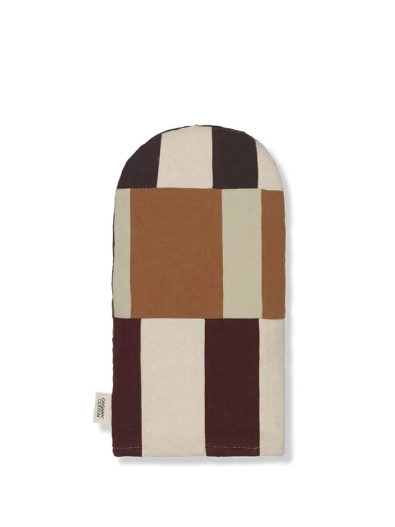 Ugnshandsken Section från ferm LIVING har ett grafiskt mönster i rogivande, jordnära färgtoner som påminner om ett modernt lapptäcke. Den här robusta ugnshandsken är tillverkad av ekologisk bomull och fylld med återvunnen polyester som tål att användas regelbundet, år ut och år in. Ugnshandsken Section är utrustad med en randig upphängningsögla.