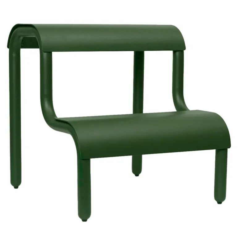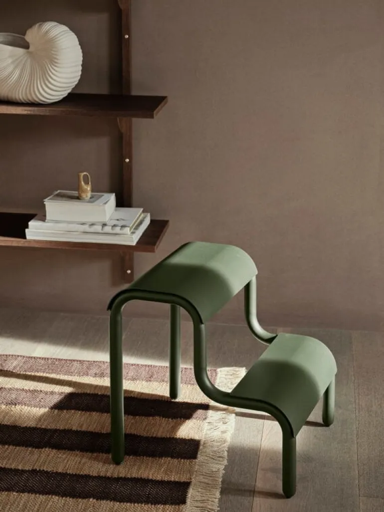 Pallen Up Step från ferm LIVING har en lekfull, naturlig siluett som gör den till ett dynamiskt komplement i valfritt rum. Pallen i järn består av två krökta metallrör som bildar pallens ben, mellan vilka två steg har monterats. Ytan på de rundade stegen har behandlats för att förhindra att den välvda formen gör dem hala.