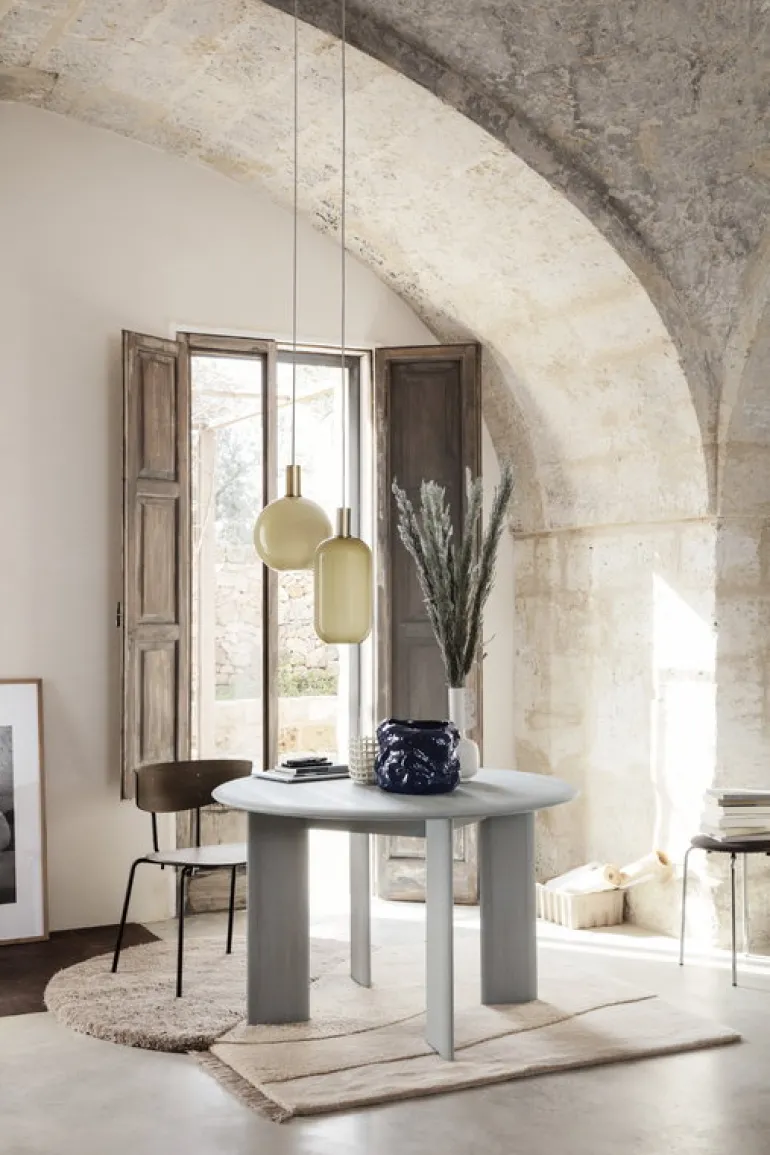 Ferm Livings View-matta har en överraskande form som visar jorden från rymden: de geometriska linjerna och den runda organiska känslan på den tuftade mattan återupprepar de naturliga formerna av bergsryggar och öknar. View-mattan tillverkas för hand av mjukt och tåligt ull från Nya Zeeland, mattan bär en varm och avslappnad känsla som understryks av de roliga asymmetriska fransarna och höjdvariationerna.