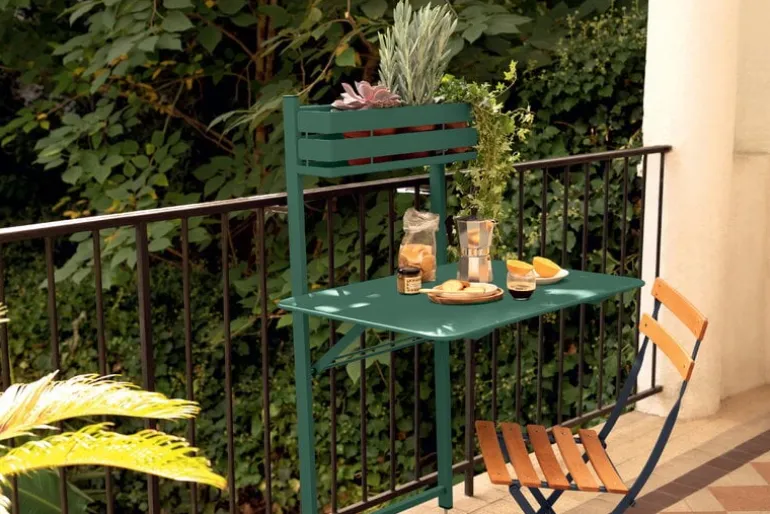 Fermobs fällbara bord Bistro Balcony är inte bara charmigt och praktiskt, utan också väderbeständigt – den UV-beständiga pulverlacken garanterar klara färger i många år framöver. Kollektionen Bistro tillverkas i Fermobs fabrik i Frankrike av material av högsta kvalitet.
