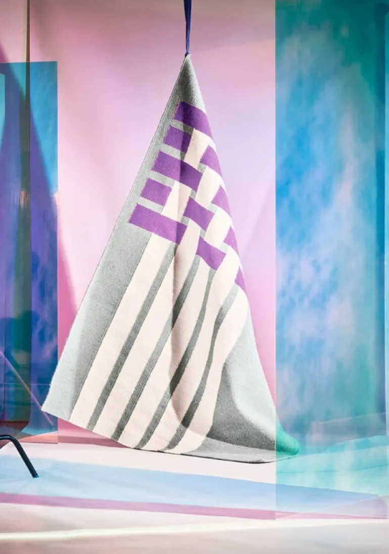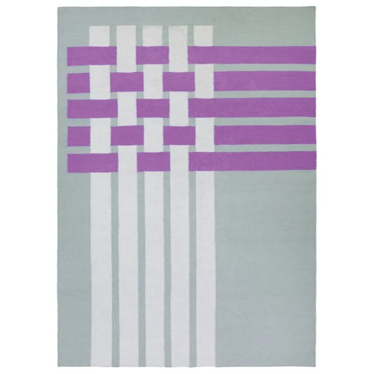 Finartes Bond-matta är dekorerad med grafiska linjer och geometriska former. De ljusa färgerna på ullmattan skapar ett harmoniskt mönster, med tjocka lila och vita linjer som flätas samman över varandra på en aqua-bakgrund – som om de vertikala och horisontella ränderna var flätade tillsammans. Den eleganta mattan är en del av Finartes Blending-kollektion, där färger och former blandas, mixas och överlappar varandra. Precis som andra Finarte-mattor är Bond-mattan handgjord i Indien och har en QR-kod som du kan skanna för att spåra mattans resa från material till slutprodukt.