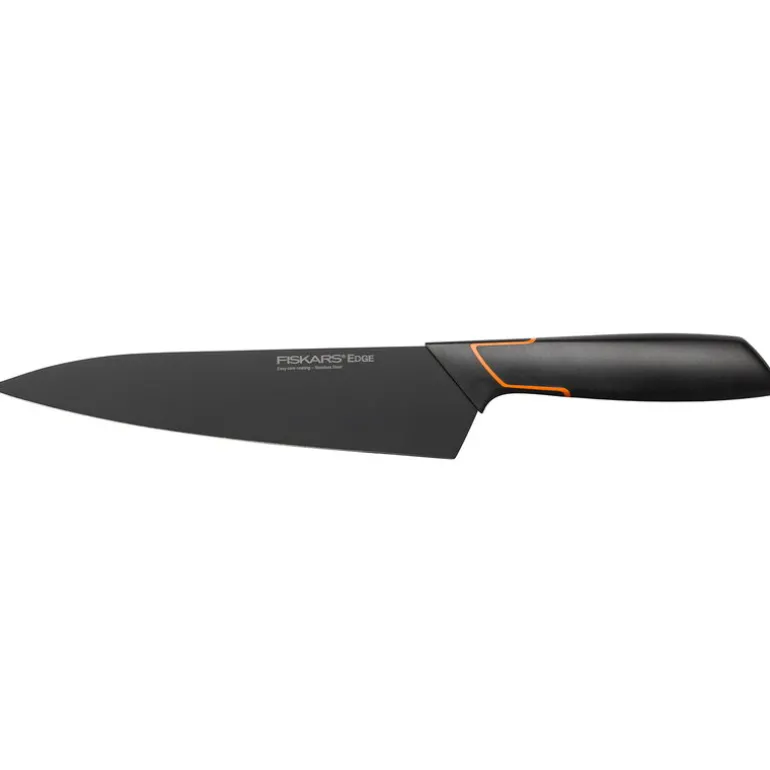 Kockkniven Edge, från Fiskars, är den perfekta universalkniven för grönsaker eller kött. Den stora kockknivens rostfria stålblad har en non-stick beläggning som gör kniven väldigt slitstark och enkel att rengöra – dessutom får bladet sin igenkännbara svarta färg från beläggningen. Knivens handtag har en ergonomisk form som gör kniven väldigt enkel och bekväm att använda. Kockkniven Edge kan diskas i diskmaskin.
