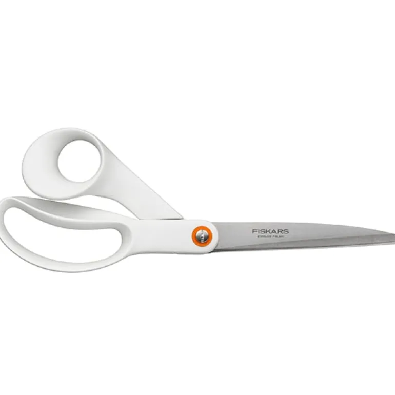 Universalsaxen Functional Form från Fiskars kan användas till en rad olika material. De patenterade, ergonomiska handtagen ger ett bekvämt grepp och de långa bladen gör det lättare att klippa. Dessutom är bladspänningen justerbar.