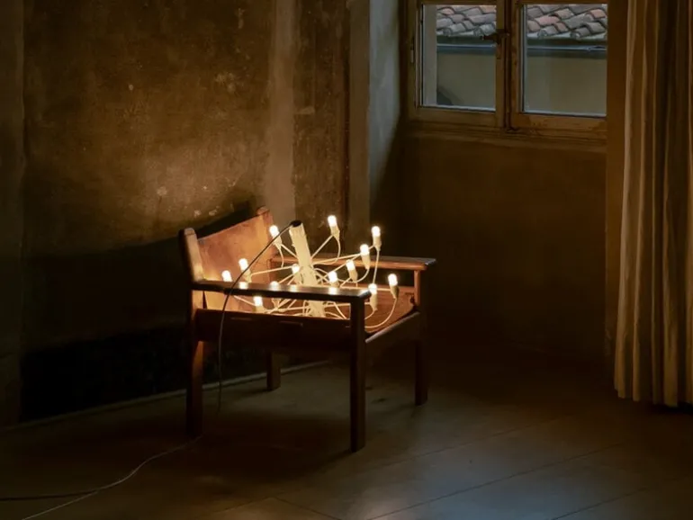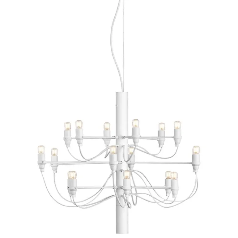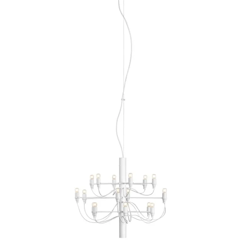 2097/18 är en unik ljuskrona designad av Gino Sarfatti för det italienska märket Flos år 1958. Den vita stålramen på 2097/18 är omgiven av ett stämningsfullt arrangemang som utgörs av 18 LED-lampor. Lampornas strömkablar har inte dolts, utan de fritt flödande kablarna är tvärtom ett viktigt element i ljuskronans design och ger den en mjuk och organisk karaktär. 2097/18 är en kombination av praktfullheten från traditionella ljuskronor och den modernistiska stilen från 1950-talet, med en touch av enkel och industriell estetik. Med en diameter på 67 cm drar 2097/18 blickarna till sig även i stora och öppna utrymmen, och dess fint avvägda elegans passar till både klassiska och moderna interiörer.
