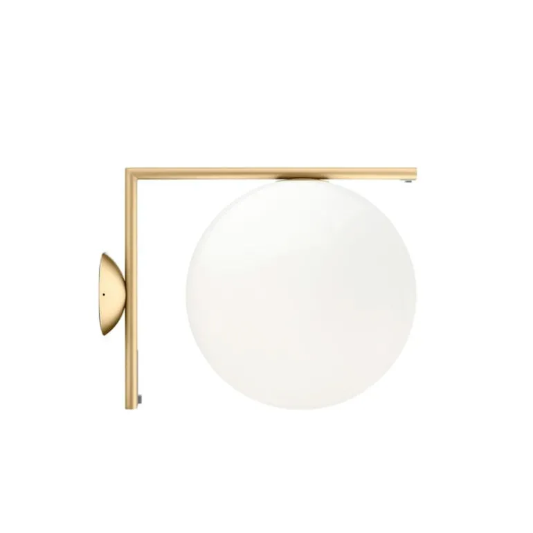 Vägg- och taklampan IC C/W2, från det italienska märket Flos, är en del av IC-kollektionen som designades 2014 av Michael Anastassiades. Armaturen har en karaktär av industriell enkelhet och elegant symbolism och består av en vinklad metallram i blank mässing och en rund diffusor i vitt opalglas som filtrerar ljuset på ett fint och mjukt sätt.