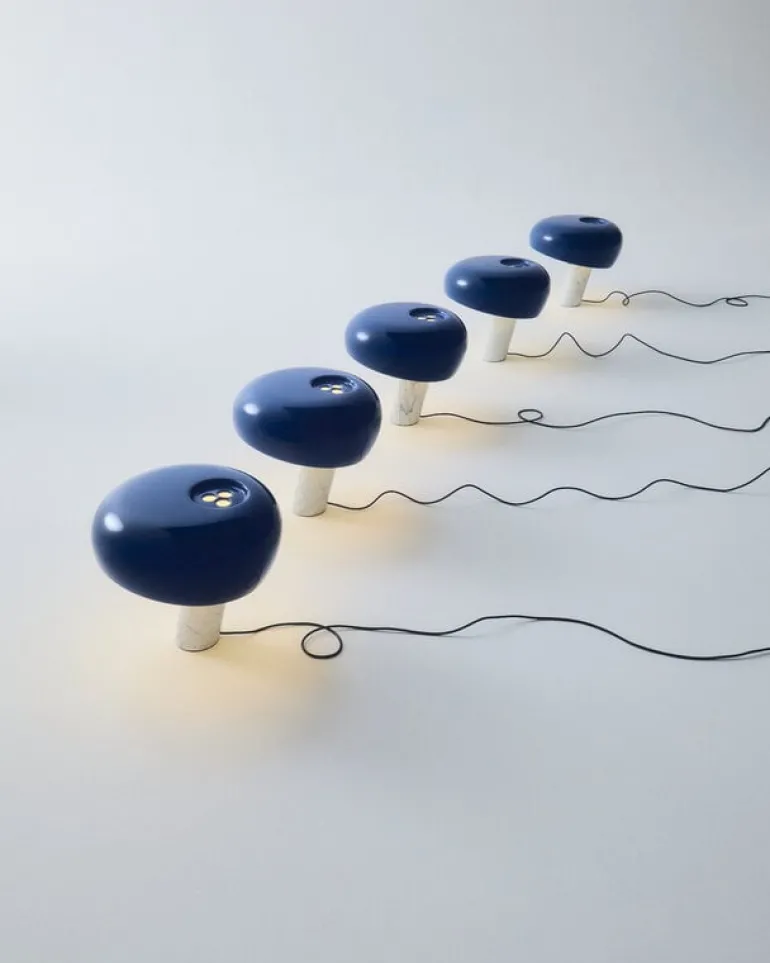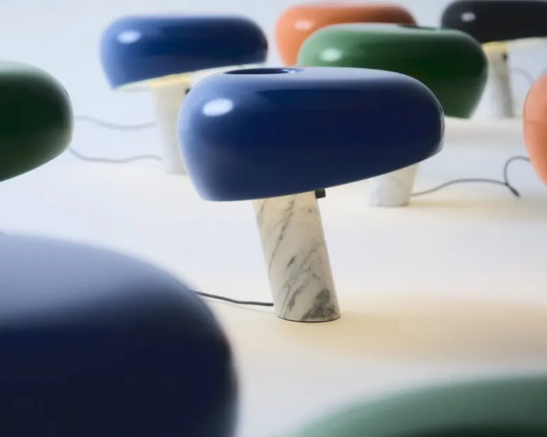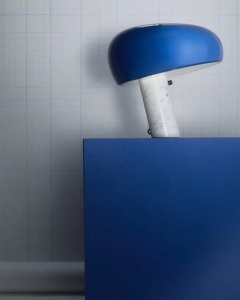 Bordslampan Snoopy från det italienska designmärket Flos kombinerar en vit marmorbas med en blå emaljerad metallskärm och en tjock glasskiva som försiktigt sprider ljuset. Den glada och eleganta bordslampan fick sitt namn efter hunden Snoopy i serien Knatte, Fnatte och Tjatte, eftersom reflektorn har en distinkt beagle-liknande silhuett. Den italienska arkitektduon Achille och Pier Giacomo Castiglioni designade Snoopy-lampan redan 1967, och Flos har uppdaterat lampan med en modern touch-sensor-dimmer.