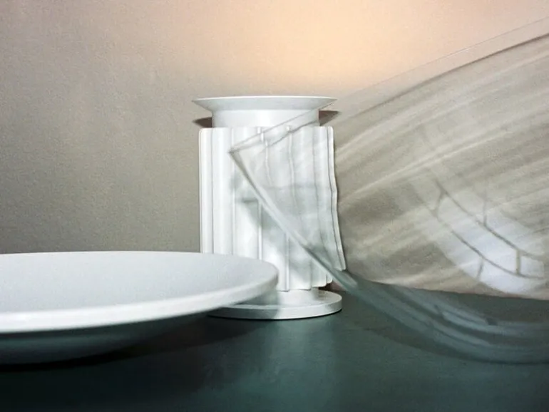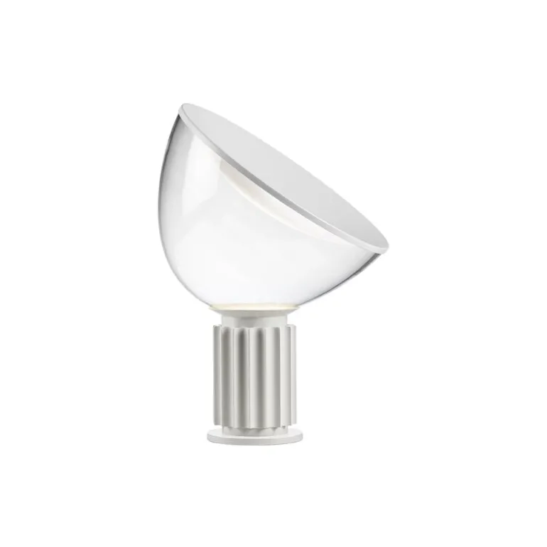 Bordslampan Taccia designades 1962 av Achille och Pier Giacomo Castiglioni för det italienska designmärket Flos. Bröderna Castiglioni experimenterade ofta med olika perspektiv, och inspirationen till Taccia kom från en idé om en uppochnedvänd taklampa. Taccia står på en djärv, dekorativ bas, och avger reflekterat ljus genom en stor diffusor gjord i blåst glas med en konkav reflektor. Tack vare den vridbara diffusorn är det enkelt att justera ljusets riktning. Taccia är en iögonfallande designklassiker vars tidlösa och lekfulla utseende kompletterar olika typer av interiörer och rum.