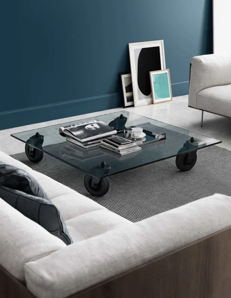 Tavolo con Ruote, som formgavs av Gae Aulenti för FontanaArte 1980, är ett soffbord som leker med industridesignens estetik och modern minimalism. Aulenti fick idén till bordet från vagnar som används för att transportera glas i FontanaArtes fabrik – hon ersatte vagnens trähylla med en tjock glasskiva och kombinerade den med stora, fritt rullande industrihjul. Tavolo con Ruote är perfekt på ställen där du behöver flytta på soffbordet ibland. Den enkla rättframma designen gör Tavolo con Ruote till ett soffbord som alltid utgör ett charmigt inslag i inredningen.