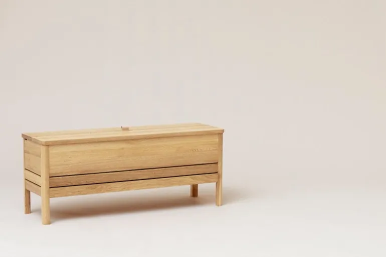Form & Refines A Line-förvaringsbänk har konstruerats av massiv ek och toppats med ett läderhandtag på locket. När bänken öppnas viks locket snyggt ihop bak på bänken och avslöjar de två förvaringssektionerna inuti. Sektionerna kan användas för att lagra dylika saker, exempelvis skor och tillbehör i hallen, lakan i sovrummet eller förnödenheter i kontoret.