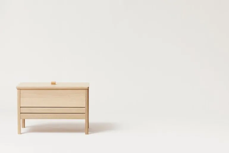 Form & Refines A Line-förvaringsbänk har konstruerats av massiv ek och toppats med ett läderhandtag på locket. När bänken öppnas viks locket snyggt ihop bak på bänken och avslöjar de två förvaringssektionerna inuti. Sektionerna kan användas för att lagra dylika saker, exempelvis skor och tillbehör i hallen, lakan i sovrummet eller förnödenheter i kontoret.
