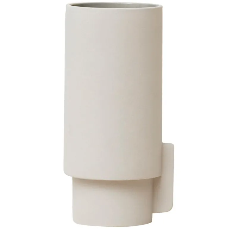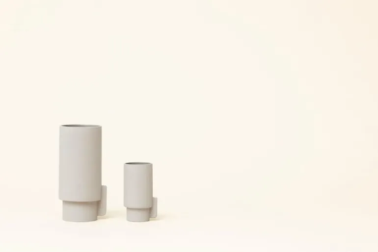 Alcoavasen, med design av Herman Studio för Form & Refine, är en del i en keramikkollektion baserad på geometriska linjer med kontraster mellan glansiga och matta ytor. Insidan av artiklarna har fått en glansig glasering medan den ljusgråa utsidan fått en matt glasering.