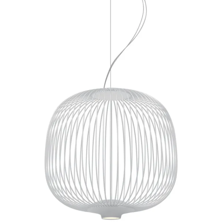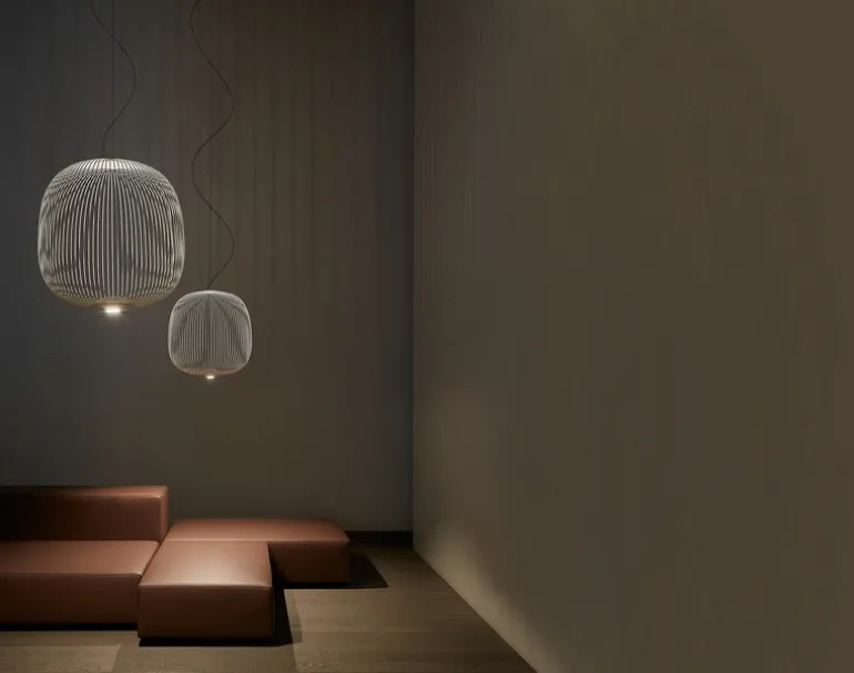 Foscarinis hänglampa Spokes 2 Piccola har en fantastisk, lätt skärm som påminner om fågelburar, antika orientaliska lyktor och, sett nedifrån, ekrar. Designerna, Vicente García Jiménez och Cinzia Cumini, inspirerades av det grafiska i cykelhjul och namngav lampan efter deras delikata metallkomponenter – ordet Piccola, i sin tur, är italienska för liten, vilket hänvisar till lampans storlek.