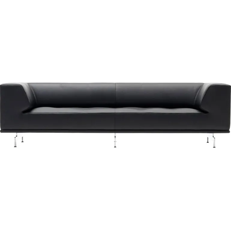 Fredericias Delphi-soffa ger lyxig elegans och genomtänkt estetik till ett vardagsrum eller en lobby. Delphi-soffan har armstöd och ryggstöd som är lika höga, vilket resulterar i en inbjudande, generös och perfekt stödjande design för sittande och lounging. Den slanka metallbasen och de små kurvorna som går ner från armstöden är signaturdetaljer för den annars enkla, kuddlösa soffan.